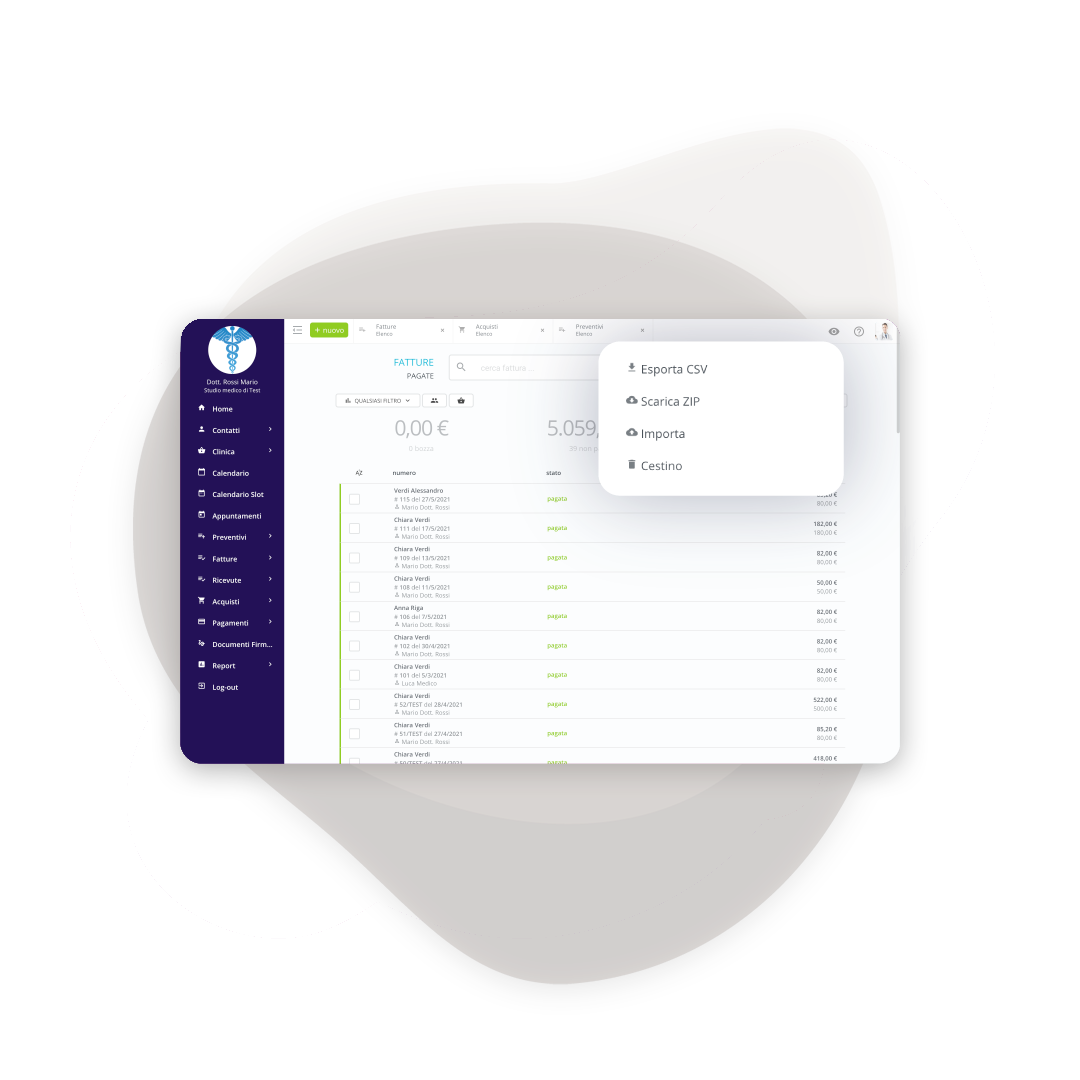 Download all your active and passive invoices in XML format to send to your accountant. He can then import them en masse into his accounting software. Or he can create a dedicated account with read-only permissions: he can see everything without touching anything.
