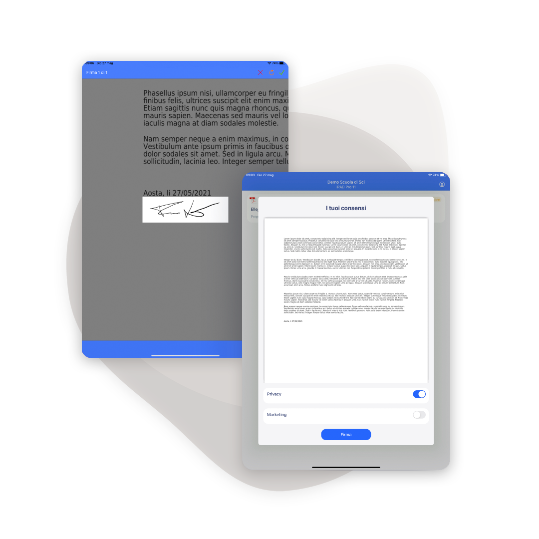 Il documento può essere predisposto nel software gestionale con campi personalizzati (spunte obbligatorie, firme multiple) oppure caricato come PDF generico (firma a fine documento). La firma grafometrica si appone su tablet con pennino certificato, esattamente come su carta. Il sistema rileva dati biometrici come pressione, velocità e accelerazione.