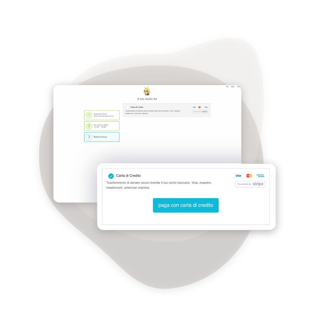 Richiedi il pagamento anticipato al momento della prenotazione. Integra PayPal, Stripe o il POS virtuale della tua banca. Il pagamento viene registrato automaticamente nel gestionale per la fatturazione elettronica.