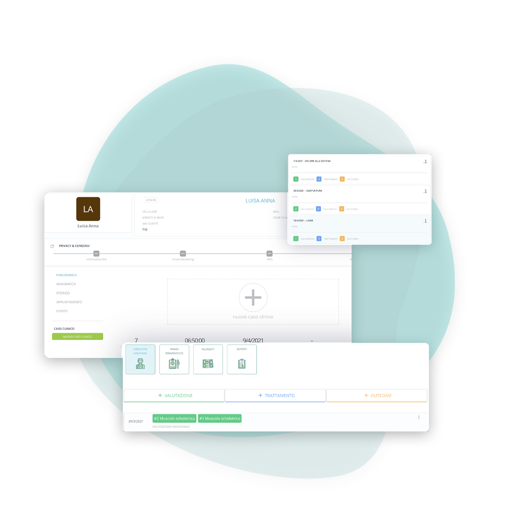 Nei centri con più specialisti, lo stesso caso clinico può includere valutazioni e trattamenti di professionisti diversi, ciascuno con le proprie schede su misura (ad esempio fisioterapia, nutrizione, psicologia, osteopatia). Ogni professionista compila la propria parte e, quando autorizzato, ha una visione condivisa del percorso del paziente: un approccio integrato, ordinato e tracciabile.