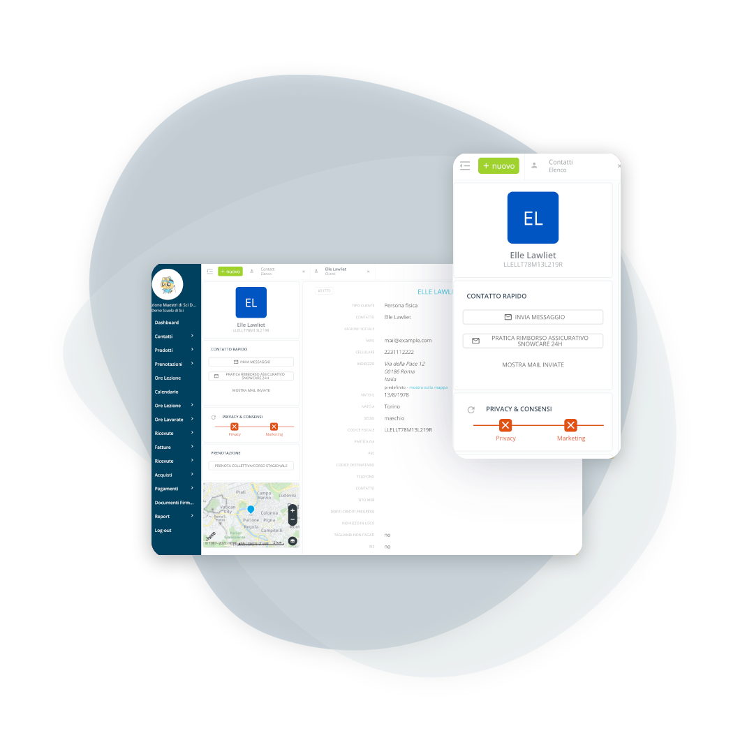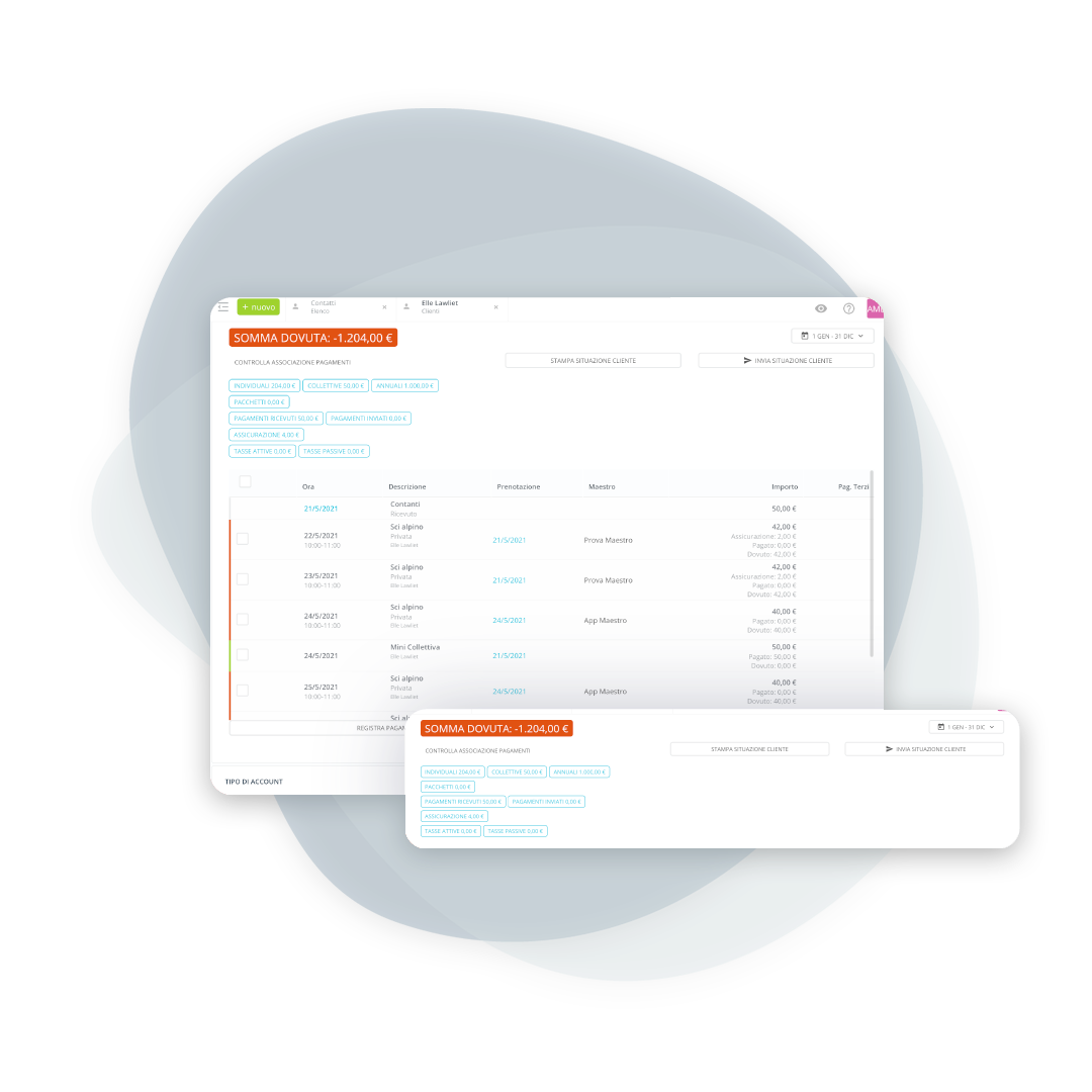 A complete, customer-by-customer view of bookings, payments, and pending events. So you know immediately who's in debt, who's in credit, and which lessons are still outstanding.
