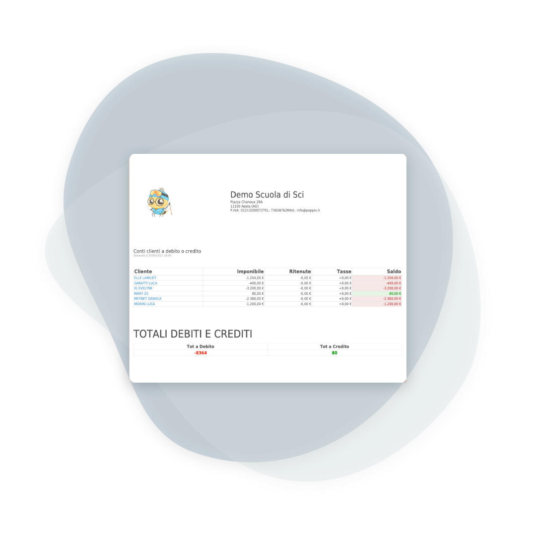 A neat layout with all bookings (in chronological order of lesson) and payments already recorded. The final balance automatically calculates whether the customer is in debit or credit, eliminating manual calculations and eliminating errors.