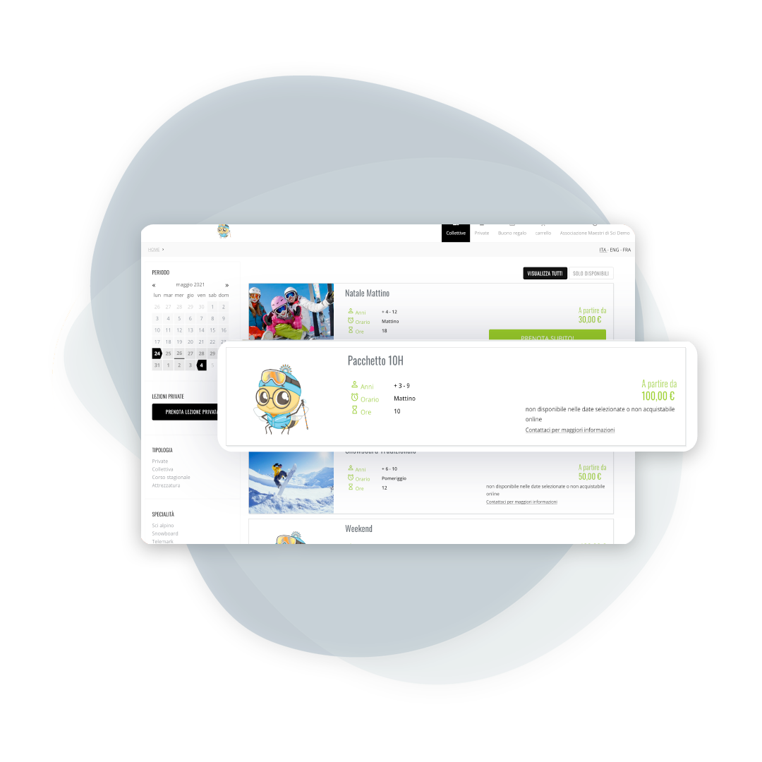 Offer private lesson packages as a gift or advance purchase: the client pays online and then arranges the days and times with the receptionist, based on the instructors' availability. Perfect for increasing sales before and during the season.